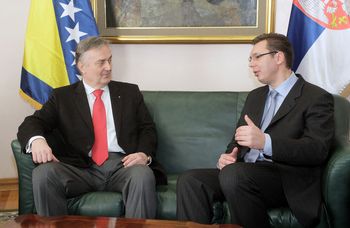 Београд, 12. април 2013. године – Први потпредседник Владе Републике Србије задужен за одбрану, безбедност и борбу против корупције и криминала и министар одбране Александар Вучић разговарао је данас са министром спољних послова и замеником председавајућег Савету министара Босне и Херцеговине Златком Лагумџијом о сарадњи и евроинтеграцијама двеју земаља.