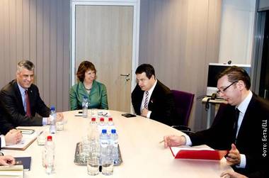 | Представник Приштине Хашим Тачи, Кетрин Ештон, Ивица Дачић и Александар Вучић |