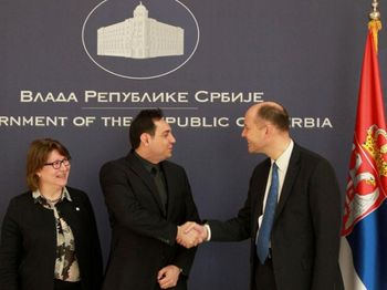 | Ирена Војацков Солорано, Александар Вулин и Питер Дуе |