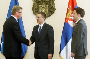 Београд, 5. мај 2014. године – Министар правде у Влади Републике Србије Никола Селаковић и министар унутрашњих послова Небојша Стефановић разговарали су данас са комесаром за проширење ЕУ Штефаном Филеом о будућим активностима Министарства правде, као и припремама Србије за почетак преговора о Поглављу 23.