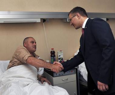 Београд, 8. јун 2014. године – Министар унутрашњих послова Небојша Стефановић са директором полиције Милорадом Вељовићем посетио је данас на Војно-медицинској академији (ВМА) у Београду крушевачке полицајце, повређене током обављања службене дужности, када је нападач из возила на њих бацио ручну бомбу.