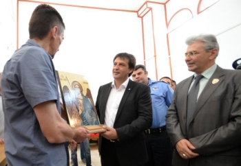 Гашић је данас обишао и радове на реконструкцији павиљона "Ц" и цркве Стефан Дечански, која се налази у оквиру зидина Завода, где су му осуђеници уручили икону Архангела Михаила.