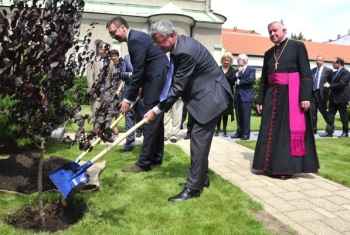 Београд, 23. јул 2014. године – Председник Владе Републике Србије Александар Вучић и амбасадор Аустрије у Србији Јоханес Ајгнер посадили су данас црвену шљиву, као дрво мира, у дворишту здања Надбискупије београдске, некадашњег Посланства Аустроугарске у Краљевини Србији, чиме су обележили 100-годишњицу предаје аустроугарског ултиматума Србији и одговора српске стране на тај документ.
