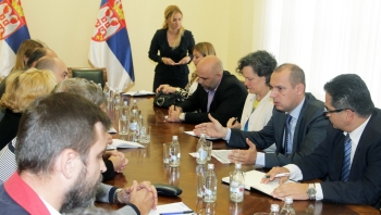 Београд, 2. октобар 2014. године – Потпредседник Владе Републике Србије и министар државне управе и локалне самоуправе Кори Удовички и министар здравља Златибор Лончар разговарали су данас са представницима репрезентативних синдиката у области здравства о Нацрту закона о платама и о мерама штедње.