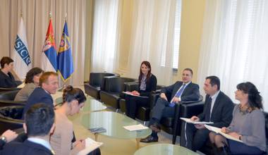 Београд, 28. јануар 2015. године – Министар унутрашњих послова у Влади Републике Србије Небојша Стефановић и шеф Мисије ОЕБС-а у Србији Питер Буркхард разговарали су данас о актуелној сарадњи и доношењу новог закона о полицији, који ће допринети реформским процесима и унапређењу рада МУП-а.