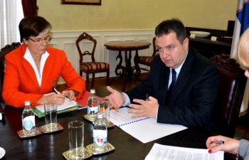 Београд, 2. фебруар 2015. године – Први потпредседник Владе Републике Србије и министар спољних послова Ивица Дачић, који је и председавајући ОЕБС-у, разговарао је данас са високим комесаром Организације за европску безбедност и сарадњу (ОЕБС) за националне мањине Астрид Торс.