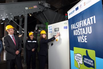 Ковач је у складишту Тржишне инспекције у Београду објаснила да је машина за уништавање фалсификата део пројекта "Спровођење права интелектуалне својине", који ЕУ финансира са 2,8 милиона евра из претприступних фондова, при чему се још две такве машине налазе Крушевцу и Иригу.