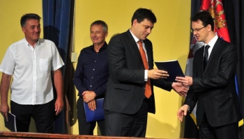 Београд, 9. јул 2015. године – Министар просвете, науке и технолошког развоја у Влади Републике Србије Срђан Вербић уручио је данас уговоре извођачима радова за изградњу, проширење и реконструкцију 51 школе у Србији, у оквиру Програма модернизације школа у Србији.