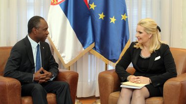 Београд, 17. јул 2015. године – Потпредседник Владе Републике Србије и министар грађевинарства, саобраћаја и инфраструктуре Зорана Михајловић и директор Уницефа у Србији Мишел Сен Ло разговарали су данас о сарадњи у области сузбијања насиља у породици и унапређењу безбедности деце у школама у случају земљотреса и поплава.