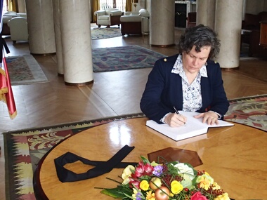 Београд, 16. новембар 2015. године – Потпредседник Владе Републике Србије и министар државне управе и локалне самоуправе Кори Удовички уписала се данас у књигу жалости која је, поводом терористичких напада у Паризу, отворена у Амбасади Француске у Београду.