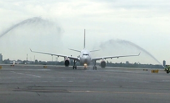 Летелица је на Аеродрому ЈФК дочекана воденим топовима, у знак добродошлице, као и електронским билбордом на коме је писало "ЈФК аеродром поздравља Ер Србију".