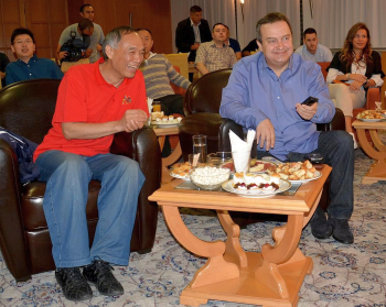 | Амбасадор НР Кине у Србији Ли Манчанг и Ивица Дачић заједно прате финални одбојкашки меч на олимпијском турниру у Бразилу |