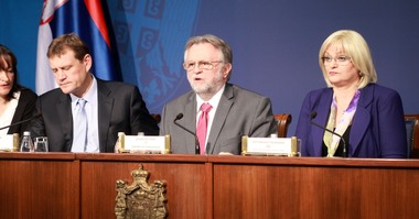 Конференција за новинаре у Влади Србије одржана је на крају посете Мисије ММФ-а, која је у Београду боравила од 20. октобра ради разговора о шестој ревизији стендбај аранжмана из предострожности који је Србија склопила са том финансијском институцијом.