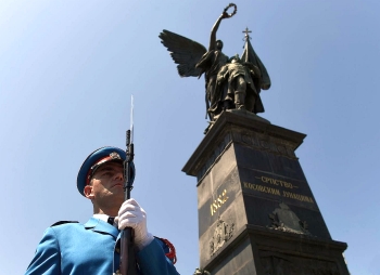 Припадници војске и гардисти дочекали су раније данас председника код Споменика косовским јунацима у Крушевцу, где су положени венци.