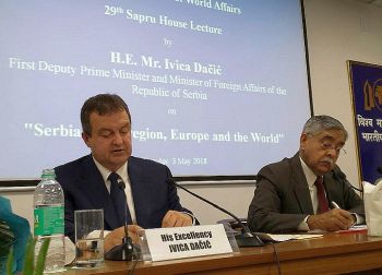 Београд/ Њу Делхи, 3. мај 2018. године – Први потпредседник Владе Републике Србије и министар спољних послова Ивица Дачић одржао је данас, током званичне посете Индији, предавање на угледном Индијском савету за међународне послове, на тему „Србија у региону, Европи и свету“.