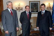 Председник Србије Борис Тадић, високи представник ЕУ за спољну политику и безбедност Хавијер Солана и председник Владе Србије Војислав Коштуница |