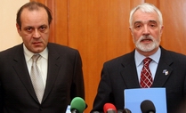 | Деметре Даскалопулос и Мирољуб Лабус обраћају се новинарима након састанка представника Владе и "Европског округлог стола" |