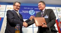 Директор Дирекције за приватизацију Републике Српске Владимир Мачкић и председник "Хемофарма" Миодраг Бабић после потписивања Уговора о сарадњи |