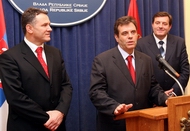 Милан Јелић, Војислав Коштуница и Милорад Додик на конференцији за новинаре после састанка |