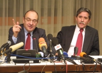 Чланови државног преговарачког тима Леон Којен и Слободан Самарџић на данашњој конференцији за новинаре у Бечу |