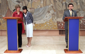 | Тереза Собјецки (прва лево) и Божидар Ђелић дају изјаве за јавност |