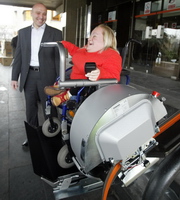 Правник у Министарству за заштиту животне средине Сњежана Јолић испробава хидрауличну рампу за инвалиде |
