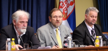 | Милан Брдар, Радомир Наумов и Љубивоје Стојановић на данашњој конференцији за новинаре |